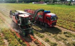 Bước vào mùa thu hoạch 1.000 ha cà chua, nông dân ở Tân Cương (Trung Quốc) sử dụng cỗ máy hái quả chín thông minh giúp giảm thời gian lao động.