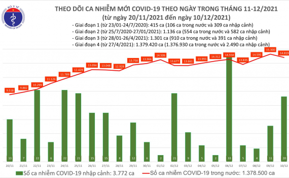 Theo bản tin Bộ Y tế về tình hình dịch Covid-19, ngày 10/12, cả nước ghi nhận thêm 14.839 ca mắc mới, trong đó có 8.843 ca cộng đồng.