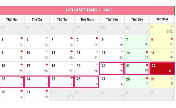 Bộ Nội vụ đã thống nhất trình Chính phủ phương án nghỉ Tết Nguyên đán 2023 từ ngày 20/1/2023 đến ngày 26/1/2023 Dương lịch.