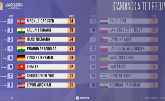 Lê Quang Liêm đứng thứ sáu vòng bảng, và gặp kỳ thủ trẻ gây nhiều tranh cãi Hans Niemann ở tứ kết cờ nhanh online Generation Cup hôm 21/9.