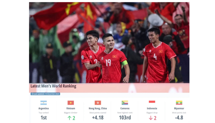 Theo Bảng xếp hạng của Liên đoàn Bóng đá Thế giới (FIFA) của tháng 12/2024 vừa được công bố, đội tuyển Việt Nam đã tăng 2 bậc so với tháng trước, từ vị trí 116 lên vị trí 114 thế giới.