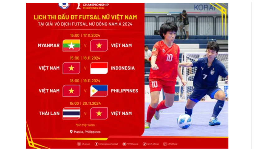 Theo lịch thi đấu giải Futsal nữ Đông Nam Á 2024, ĐT Futsal Nữ Việt Nam sẽ đã trận ra quân gặp đội tuyển Futsal Nữ Myanmar.