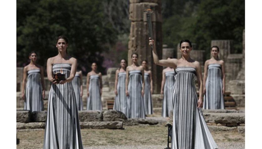 Trong vai nữ tư tế cao cấp, nữ diễn viên Mary Mina đã sử dụng gương parabol và tia nắng Mặt Trời để đốt cháy ngọn đuốc trong buổi tổng duyệt trước khi buổi lễ truyền thống diễn ra tại Olympia cổ đại.