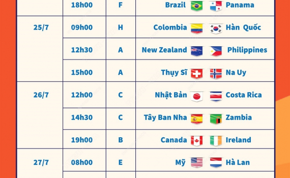 Lịch thi đấu vòng bảng World Cup nữ 2023