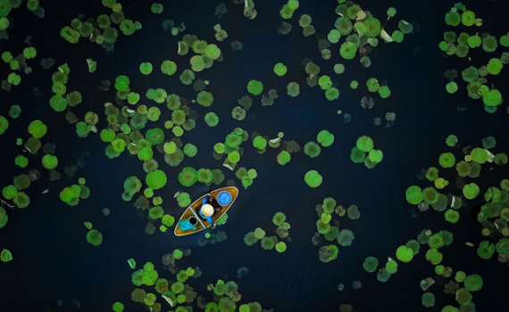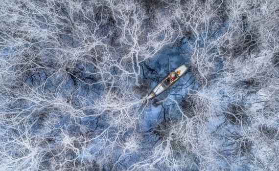 Bức ảnh chụp người dân đánh cá trên phá Tam Giang (Huế) vào mùa đông đoạt giải nhất hạng mục Con người của cuộc thi ảnh chụp trên cao.
