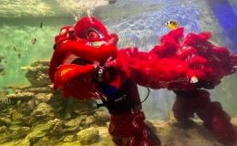 Những kỹ thuật viên của Viện Hải dương học Nha Trang (Khánh Hòa) đã có màn biểu diễn múa lân đặc sắc dưới nước nhân dịp Tết Trung thu.