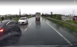 Chiếc sedan đi ngược chiều ở làn đường sát dải phân cách trên cao tốc Hà Nội-Bắc Giang bị ôtô đi đúng chiều ép quay đầu hôm 9/6.