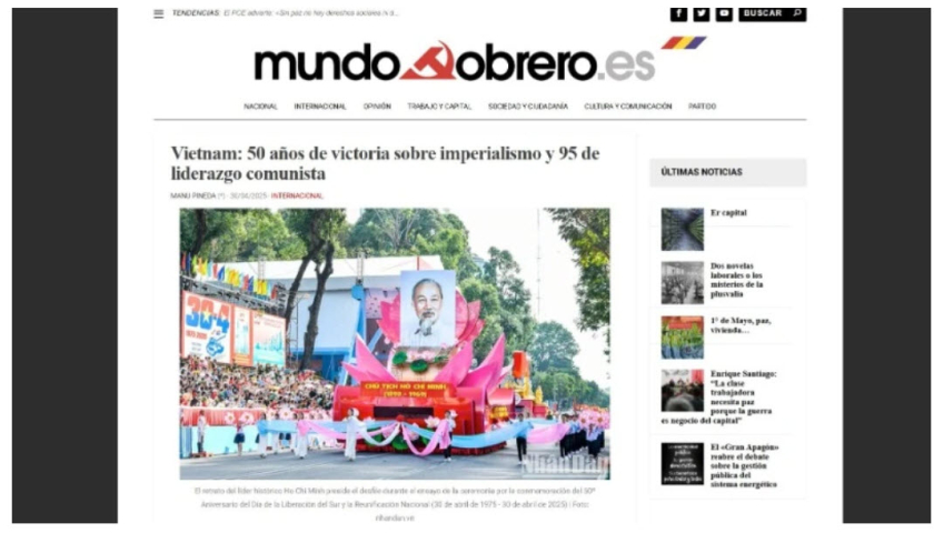 Ngày 30/4, Mundo Obrero, kênh truyền thông chính thức của Đảng Cộng sản Tây Ban Nha (PCE), đăng bài viết đề cập tới các mốc son lịch sử và ca ngợi các thành tựu đạt được của Việt Nam sau 50 năm chiến...