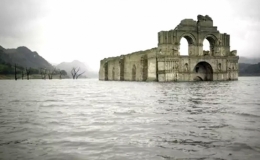 Nhà thờ Apostle Santiago ở Quechula, Mexico chìm hoàn toàn từ năm 1966, tuy nhiên nắng nóng kéo dài, dẫn tới lượng nước ở hồ chứa sụt giảm để lộ toàn bộ...