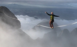 Người đàn ông đi thăng bằng trên dây giữa các vách núi