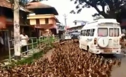 Thời tiết nắng nóng khiến những người chăn vịt ở Kerala, miền Nam Ấn Độ, phải lùa vịt xuống phố đi tìm thức ăn ở những cánh đồng có nước, gây cảnh tắc...