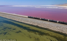 Kỳ lạ: Hồ muối có hai màu xanh - đỏ, được ngăn đôi bởi đường tàu hỏa