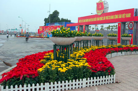 Trung tâm Hội nghị Quốc gia Mỹ Đình và hàng loạt tuyến phố của thủ đô rực rỡ cờ hoa, băng rôn và những chậu hoa cảnh.
