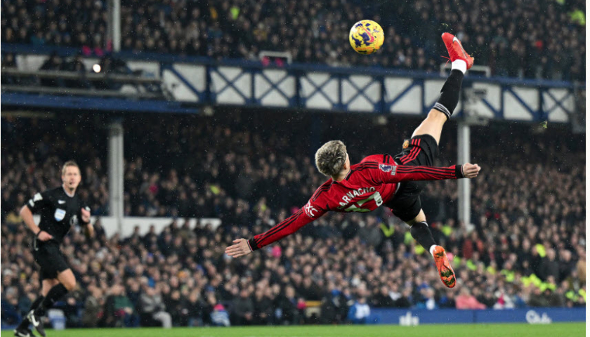 Tiền vệ 19 tuổi Alejandro Garnacho ngả người móc bóng ngược mở tỷ số, khi Man Utd thắng chủ nhà Everton 3-0 ở vòng 13 Ngoại hạng Anh.