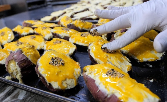 Nếu có cơ hội đến Hàn Quốc, bạn có thể thưởng thức món khoai lang nướng hấp dẫn được kết hợp với bơ và kem phô mai.