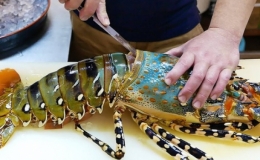 Tôm hùm có thịt chắc, mang vị ngọt thơm đặc trưng chinh phục thực khách. Đầu bếp Thái Lan sơ chế, quét một lớp bơ mỏng và nướng tôm trên bếp than tạo nên...