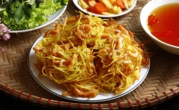 Bánh tôm vàng rộm, vỏ giòn tan, tôm đồng đỏ au mềm ngọt. Khi ăn, cắt thành miếng nhỏ ăn kèm rau sống chấm nước mắm chua ngọt, dưa góp khá bắt vị vào những...