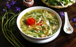 Bát canh cuốn vị bởi nước sóng sánh, khoai tây bùi bùi, rau cần giòn ngọt, thơm mùi tỏi, thoảng vị ngọt hậu từ mắm tôm.