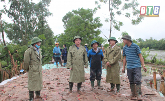 Đồng chí Phó Bí thư Tỉnh ủy, Chủ tịch UBND tỉnh kiểm tra công tác xử lý sự cố sạt lở đất bên mang cống khu nuôi trồng thủy sản xã Thái Thượng