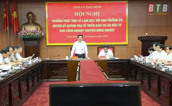 Chiều ngày 30/8, Thường trực Tỉnh ủy tổ chức hội nghị làm việc với Ban Thường vụ Huyện ủy Quỳnh Phụ về việc triển khai dự án đầu tư khu công nghiệp chuyên nông nghiệp tại huyện Quỳnh Phụ của Tập đoàn...