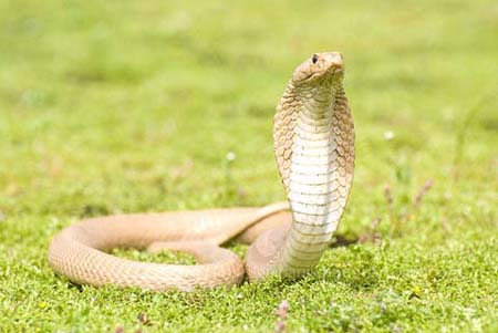 Rắn hổ mang - Tên khoa học là Naja Naja atra cantor. Có nhiều tên gọi khác như Hổ mang bành, hổ mang phì, rắn hổ đất. Rắn trưởng thành dài 1,5 - 2m, lưng màu sẫm hay vàng lục. Khi bị tấn công, rắn thường bạnh cổ sẵn sàng tấn công lại. Rắn thường sống trong các hang chuột, hang mối, gò đống và các bờ bụi.