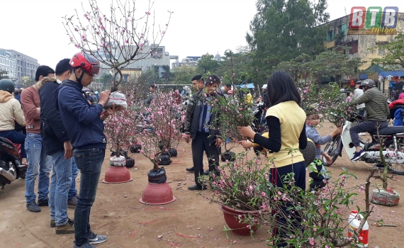 Năm Đinh Dậu chỉ còn được tính bằng giờ, thời khắc chào đón năm mới Mậu Tuất cận kề nhưng tại chợ hoa xuân khu tập thể 4 – 5 tầng, phường Lê Hồng Phong, thành phố Thái Bình vẫn tấp nập cảnh mua bán đào, quất.
