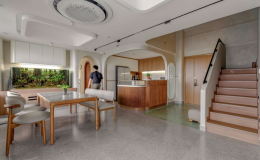 Việc bố trí mặt bằng cắt xéo giúp căn nhà tiếp cận tốt hơn với các yếu tố tự nhiên như giếng trời, sân trong và mặt thoáng. Trục giao thông mới – thay thế cho cầu thang cũ – cũng được tổ chức gọn gàng và hợp lý hơn, giúp kết nối các tầng trở nên mạch lạc mà vẫn không đánh mất tính riêng tư.