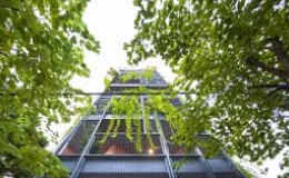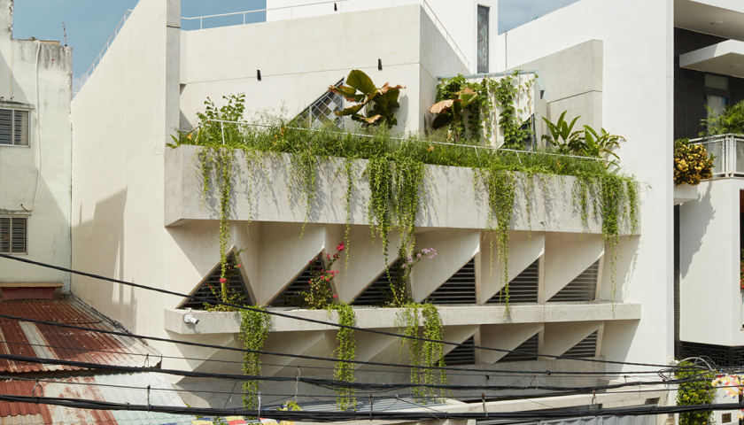 Bộ khung sắt phủ đầy mảng xanh bao bọc mặt tiền công trình, giúp giảm thiểu tiếng ồn và bụi từ đường phố, đồng thời cản mưa, nắng.