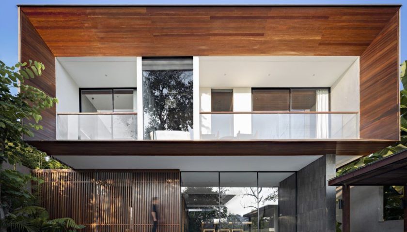 Vườn cây và hệ lam gỗ, mái hiên xòe rộng ở tầng hai giúp che mát toàn bộ không gian chức năng bên trong công trình.