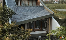 Hệ mái lớn được làm phồng, phủ thêm lớp ngói chống nóng và xòe rộng che phủ phần lớn các không gian chức năng trong nhà.