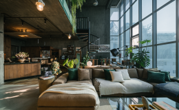 Không gian thông tầng đầy ánh sáng làm nổi bật nội thất thô ráp, khỏe khoắn theo phong cách công nghiệp của căn hộ.