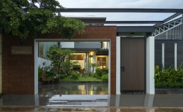 Khối nhà được xây lùi nhường chỗ cho cảnh quan sân vườn, vừa giúp cản nắng gió hướng Tây vừa làm giảm lượng nhiệt vào bên trong.