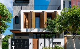 Hệ thống lam gỗ đóng mở linh hoạt vừa che mưa nắng, vừa giúp điều hòa không khí và tạo cảm giác như mặt tiền ngôi nhà biết chuyển động.