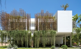 Khung tre đan cài và bao kín mặt tiền căn biệt thự, lấy ý tưởng từ trò chơi xếp gỗ Nhật Bản.