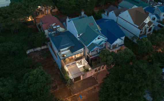 Công trình được tách thành hai khối trước - sau, tương ứng với hai biệt thự riêng biệt, kết nối với nhau qua một cầu đi bộ.