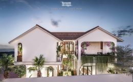 Ngôi nhà với thiết kế hình chữ U, có sân trước sau và các khoảng không hút gió thoáng mát. Ngoại cảnh đẹp mắt với mái ngói âm dương, cửa lá sách truyền...