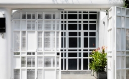 Hệ lam thép hình nón che kín mặt tiền ngôi nhà giống như một chiếc khiên nhưng được làm mềm bằng màu sơn trắng và những họa tiết nhánh cây cổ thụ tỏa ra.