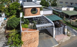 Mặt tiền nhà bao bọc bởi lớp gạch thô, khoét lỗ tròn to để gia chủ có tầm nhìn mở, đón ánh sáng tự nhiên.