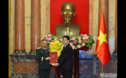 Chủ tịch nước Lương Cường trao quyết định thăng quân hàm Thượng tướng cho đồng chí Lê Quang Minh