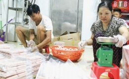 Trong khi nhiều cơ sở sản xuất gặp khó khăn trong việc tiêu thụ sản phẩm thì cơ sở sản xuất giò, chả Thuyên Dung của gia đình anh Trần Văn Trứ, thôn Lục...