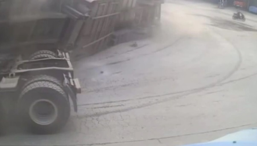 Chiếc xe đầu kéo chở theo container lớn vào cua hẹp thì bị lật ngang đổ sập xuống đường, hôm 27/3 tại Xuân Giao, Bảo Thắng.