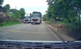 Sơn La - Chiếc xe tải vượt lên ở khúc cua gắt, chiếm hết làn ngược chiều, ép xe gắn camera hành trình đi tới phải nép sát vào lề.