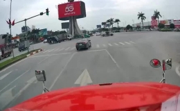 Xe máy phóng như bay, va chạm với xe bán tải tại vòng xuyến