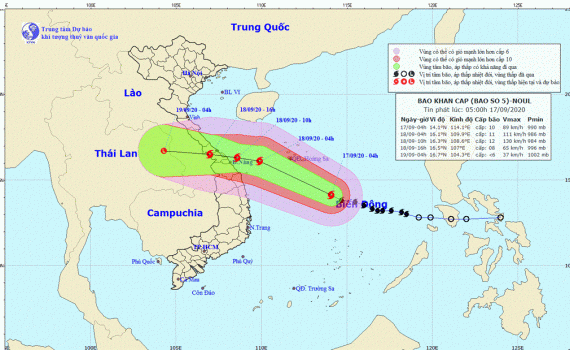 Hồi 04 giờ ngày 17/9, vị trí tâm bão ở vào khoảng 14,1 độ Vĩ Bắc; 114,1 độ Kinh Đông, cách quần đảo Hoàng Sa khoảng 380km về phía Đông Nam. Sức gió mạnh nhất vùng gần tâm bão mạnh cấp 9-10 (75-100km/giờ), giật cấp 12.