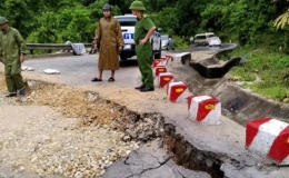 Mưa lớn trong những ngày qua khiến Quốc lộ 16, đoạn qua Dốc Chuối (xã Châu Kim, huyện Quế Phong, Nghệ An) sạt lở, sụt lún nghiêm trọng.