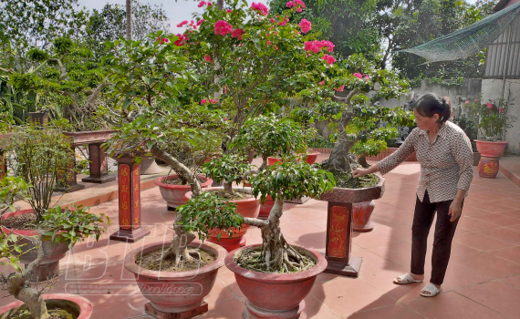 Sân, vườn nhà bà Vũ Thị Thanh, hội viên phụ nữ thôn Bương Hạ Đông, xã Quỳnh Ngọc (Quỳnh Phụ) tràn ngập sắc hoa và phong phú các loại cây trái. Ở đầu hồi nhà, dưới tán cây là bộ bàn ghế đá để gia đình ngồi...