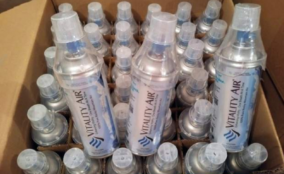 Không khí sạch lấy từ nơi có khí hậu trong lành rồi được nén vào các chai nhỏ bán cho khách hàng, sản phẩm do công ty Vitality Air sản xuất.