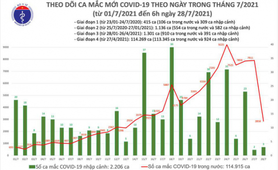 Bản tin dịch Covid-19 sáng 28/7 của Bộ Y tế cho biết có hơn 2800 ca mắc Covid-19. Đến nay cả nước ghi nhận 117.121 bệnh nhân.