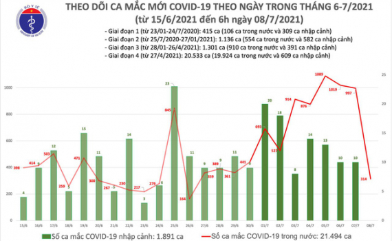 Sáng 8/7, Bộ Y tế cho biết có 314 ca mắc tại 2 địa phương là TP Hồ Chí Minh - 234 ca và Bình Dương- 80 ca.