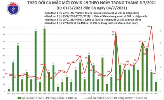 Bản tin dịch Covid-19 sáng 4/7 của Bộ Y tế cho biết có 267 ca mắc Covid-19 tại 8 địa phương. Đến nay, Việt Nam có tổng cộng 19.310 bệnh nhân.
